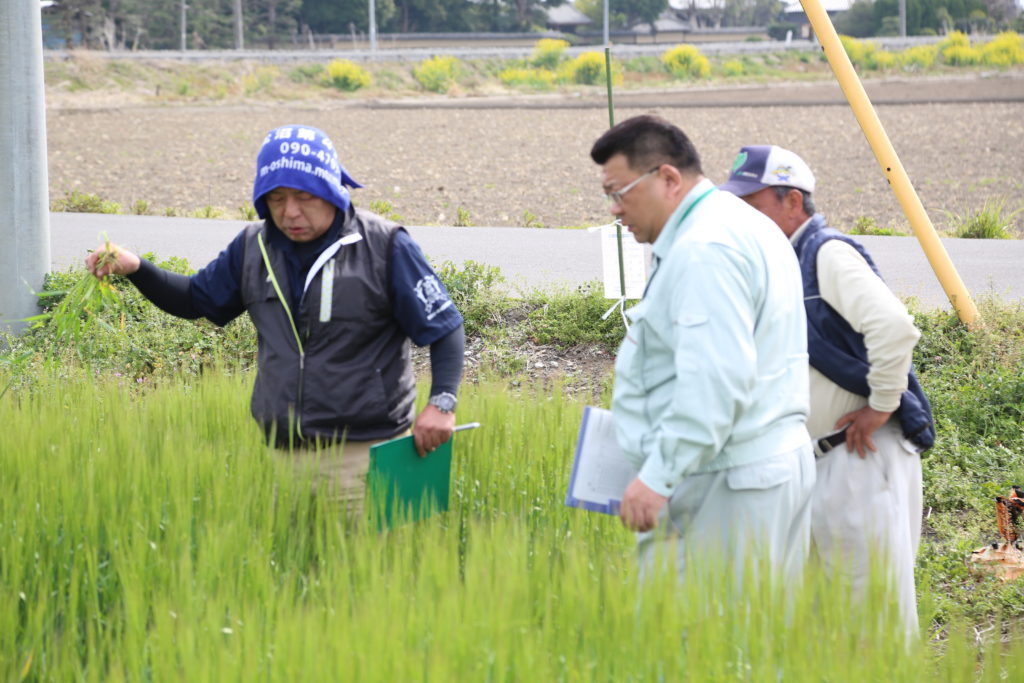 大島三千男部会長は「圃場の状態を確認し、病気や生育状況で悪い状態の部分は、第2回までに改善しよう。圃場の管理を徹底し、良質で全量合格に向けて優良種子生産に励んでいこう」と意気込みます。