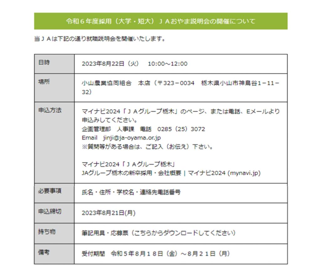 【令和6年度採用(大学・採用)JAおやま説明会の開催について】