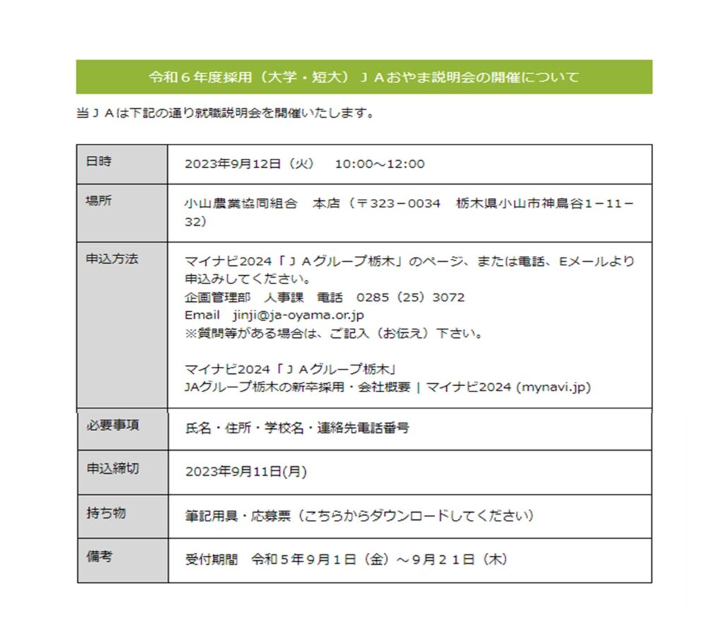 【令和6年度採用(大学・採用)JAおやま説明会の開催について】