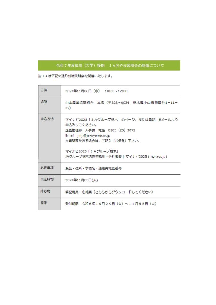 【令和7年度採用(大学・採用)JAおやま説明会の開催について】