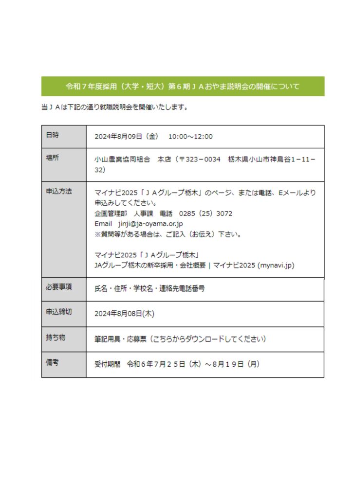 【令和7年度採用(大学・採用)JAおやま説明会の開催について】