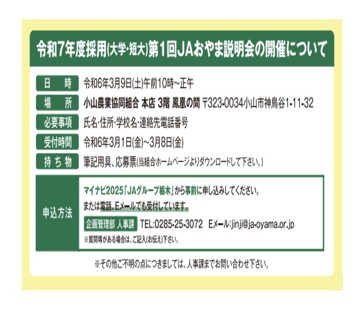 【令和7年度採用(大学/短大・採用)JAおやま説明会の開催について】