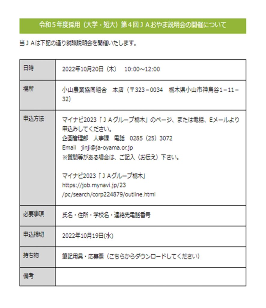 令和5年度採用(大学・短大)第4回JAおやま説明会の開催について