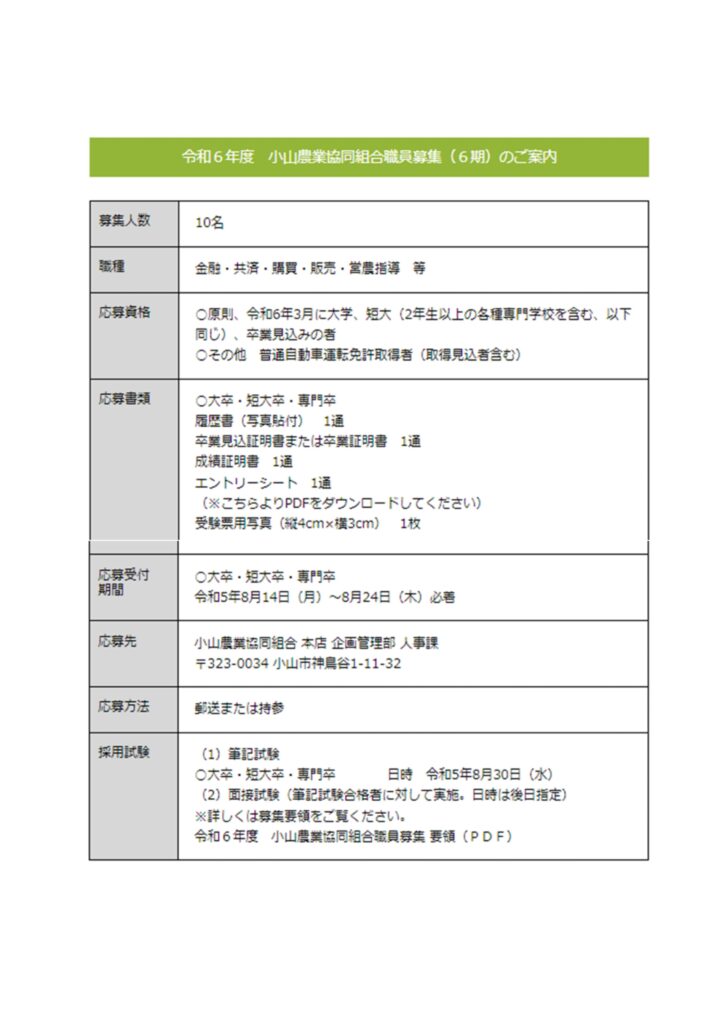 令和6年度小山農業協同組合職員募集のご案内
