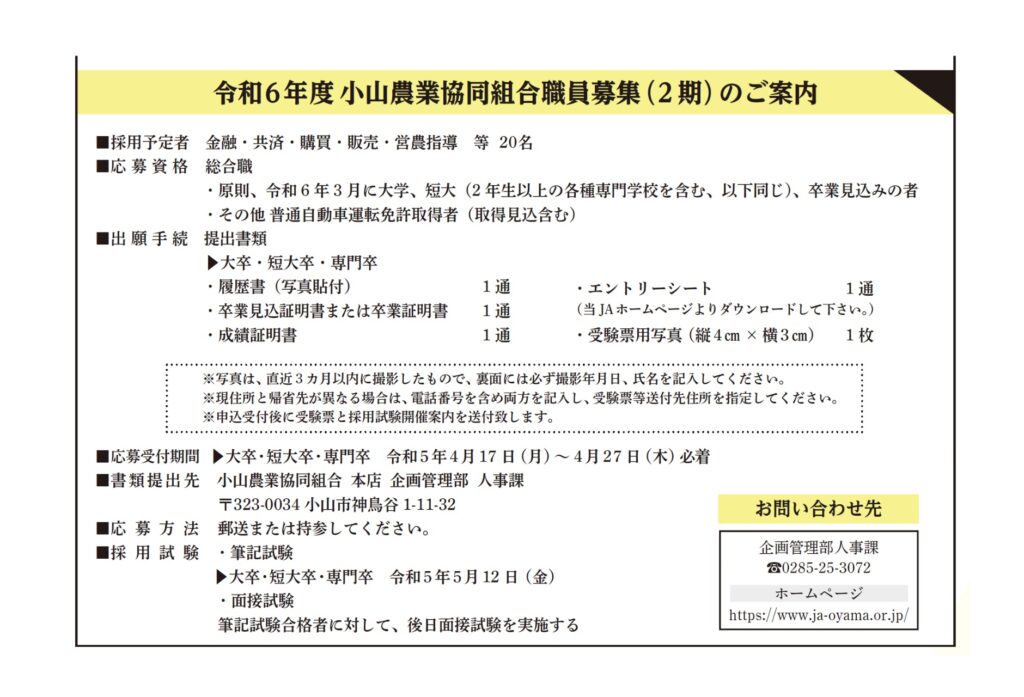 <令和6年度小山農業協同組合職員募集(2期)のご案内