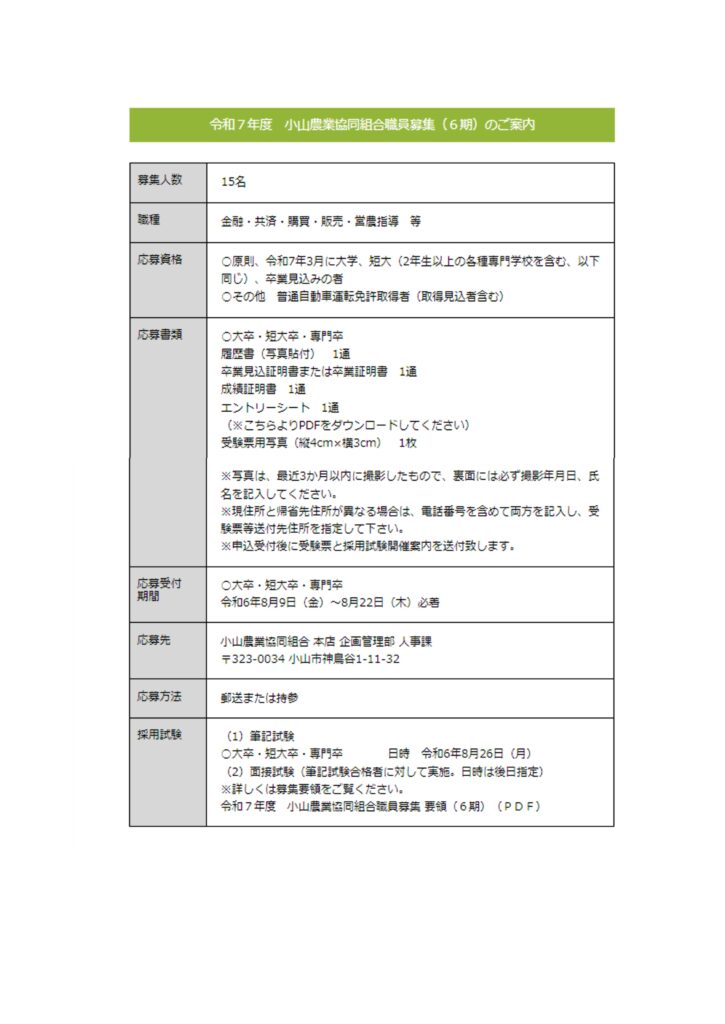 <令和7年度小山農業協同組合職員募集(6期)のご案内