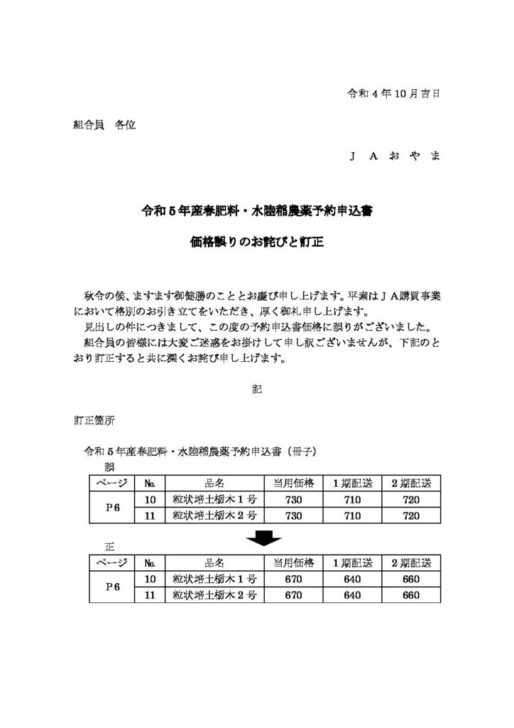 <令和5年産春肥料・水陸稲農薬予約申込書 価格誤りのお詫びと訂正