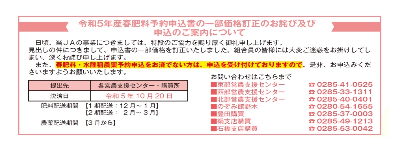 令和5年産春肥料予約申込書の一部価格訂正のお詫び及び申込のご案内について