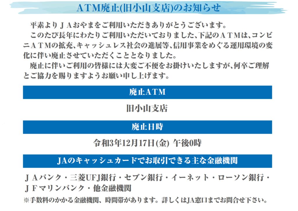 ATM廃止(旧小山支店)のお知らせ