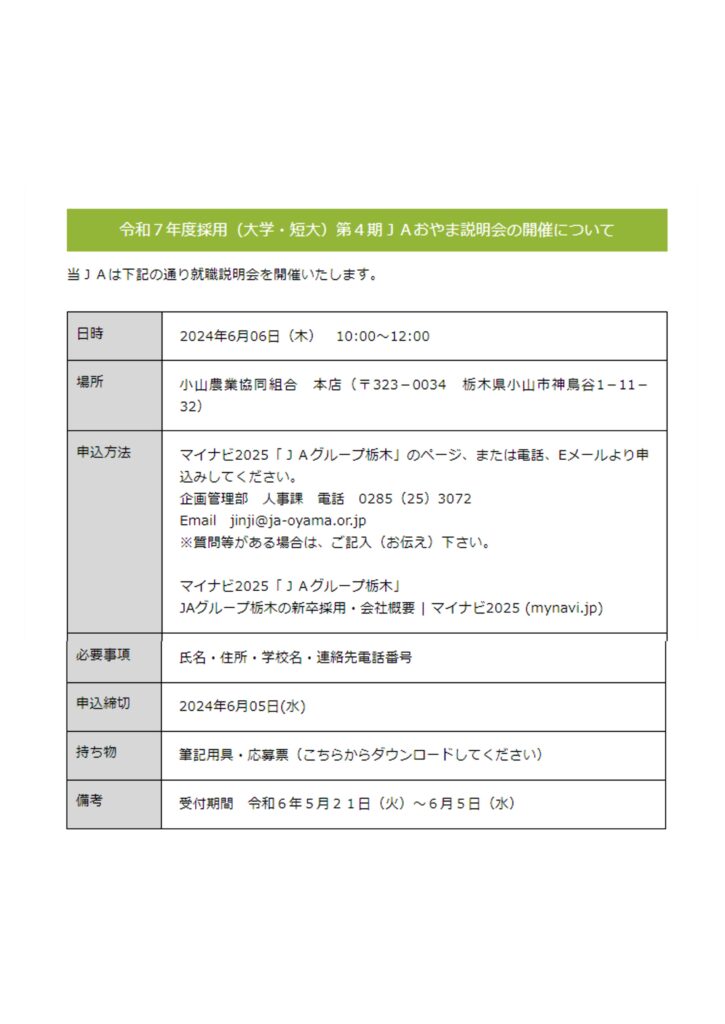 【令和7年度採用(大学・採用)JAおやま説明会の開催について】