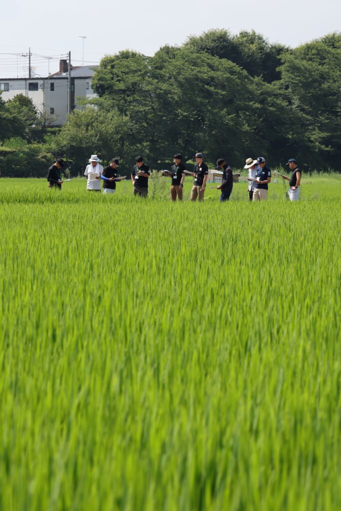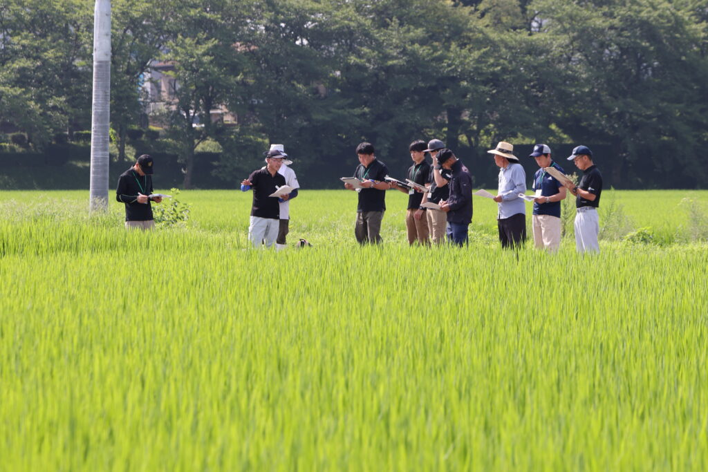 JAおやま耕種部会は7月26日、飼料用米多収品種「夢あおば」の展示圃場(ほじょう)3カ所で現地検討会を開きました。普通植・水稲生育診断圃場の生育は、7月19日の時点で順調に進んでいます。気温が高く、株間の湿度も高い場合は、紋枯病が発生しやくなり、収穫量が低下するため、本田防除を徹底するよう呼びかけました。生産者や関係者ら20人が参加しました。