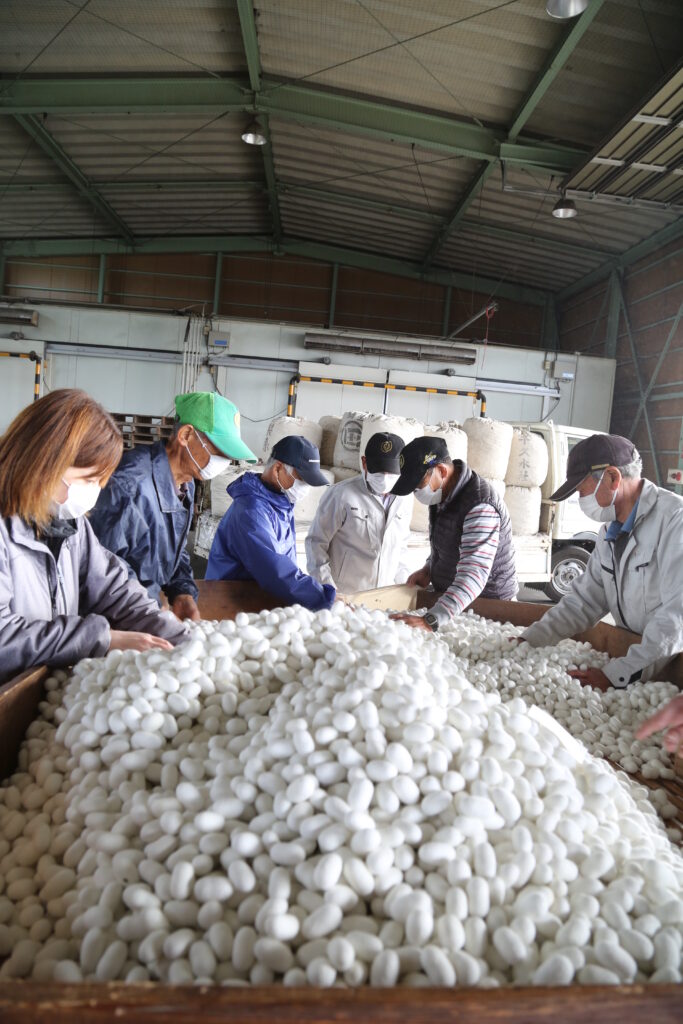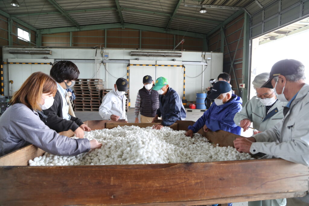 生産者6戸が袋詰めで持ち込んだ約1340キロの繭を選繭台に載せ、汚れ繭、穴あき繭、薄皮繭、玉繭などを出荷者が手作業で取り除く「選除繭」を行い、群馬県の碓氷製糸に送りました。