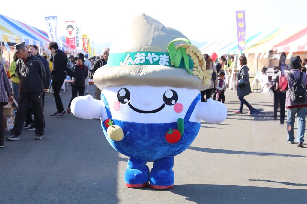 「おやまるくん」は、自然豊かな田畑が広がるJAにぴったりな米のキャラクターです。麦わら帽子をかぶり、収穫期を迎えた稲がおしゃれさを演出しています。オーバーオールの左右のポケットにはJA管内で取れたおいしい農産物がたくさん入っています。