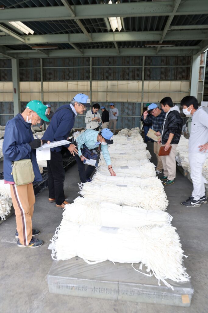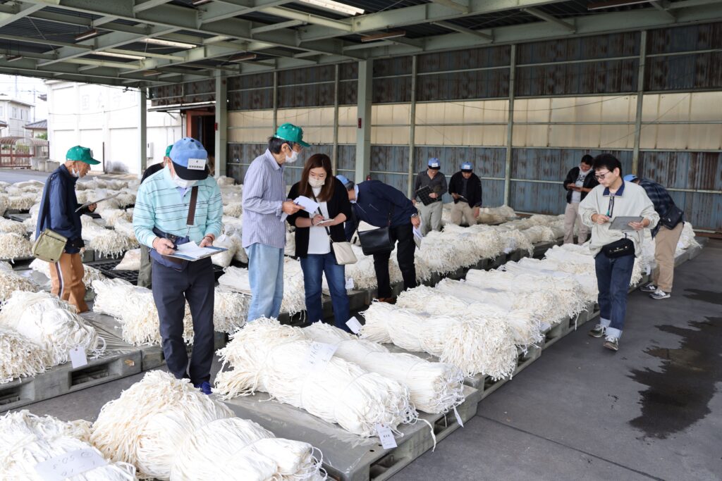 入札会には、生産者4人が約3.5トンを出荷しました。入札は15社が参加し、①種などの混入がない②真っ白③薄むき④短いものが紛れていない-などの観点から出荷品を点検して、入札価格を検討しました。入札は、集荷量で数回に分けて行い、1回ごとに落札者を発表しました。