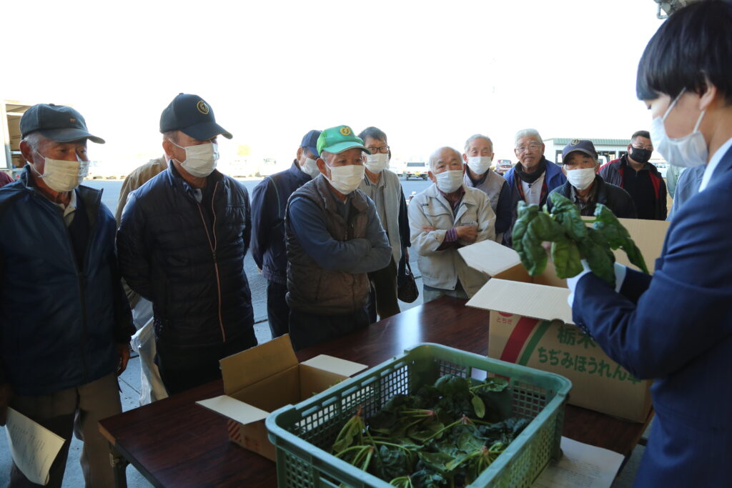 JAおやまほうれん草部会ちぢみほうれん草部は12月3日、小山市の東部集出荷所と下野市の北部集出荷所で、ちぢみホウレンソウ目ぞろえ会を開きました。部会員、関係者ら約40人が入念に出荷規格や出荷要領を確認しました。