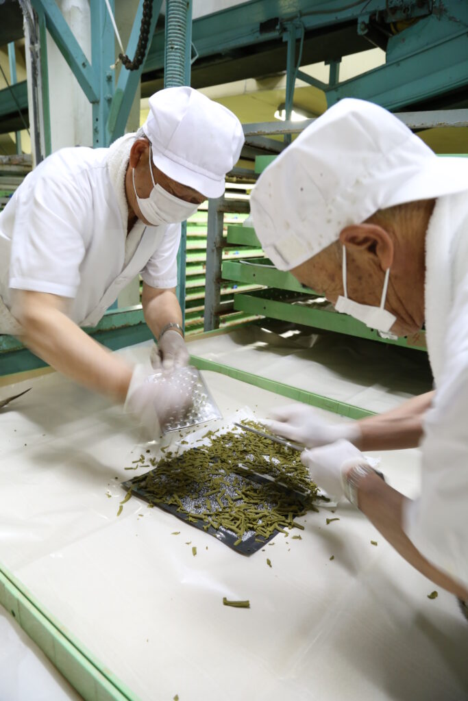 稚蚕は体が小さく弱いため、滅菌され、整備の整った環境の飼育室で人工飼料を与えます。飼育所で管理することで健康で生育のそろった蚕を農家に届けられます。白衣の作業員が、蚕座紙の上に広げた蚕に専用の切削板を使い、人工飼料を細かく切削しながら与えます。この日の給餌量は1枚当たり210グラムでしたが、10日後には12倍の2.5キロになります。