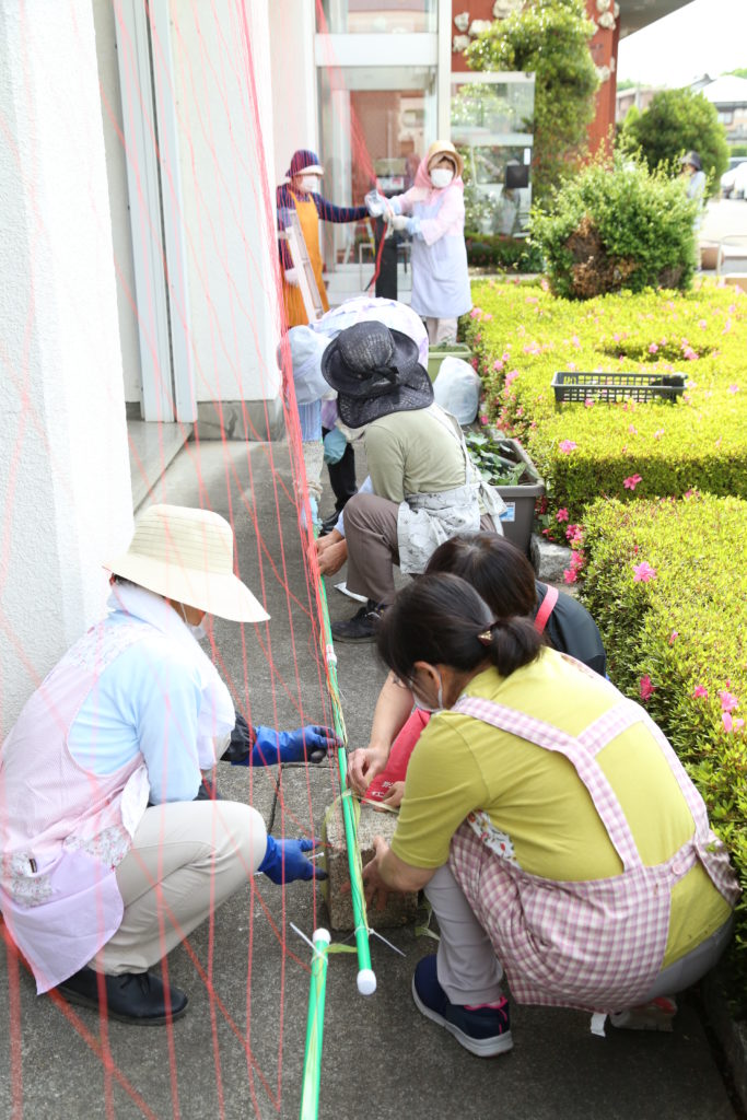 会員らは「この時期だからこそ、できる活動をしたい。外観も涼しく、地球にも優しく、つるが伸び緑のカーテンになるのが楽しみだ」と笑顔で話しました。