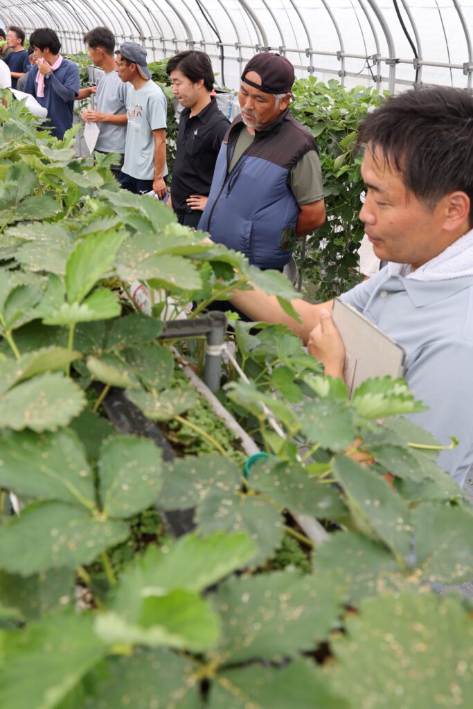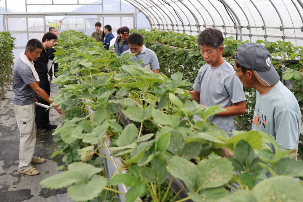 JAおやまいちご部会は8月30日、西部育苗センターで下都賀東部地区のイチゴ無病苗現地検討会を開き、2026年産の苗の生育状況を確認しました。約9万本のイチゴ無病苗の需要が見込まれ、6割以上が「とちあいか」の予定です。