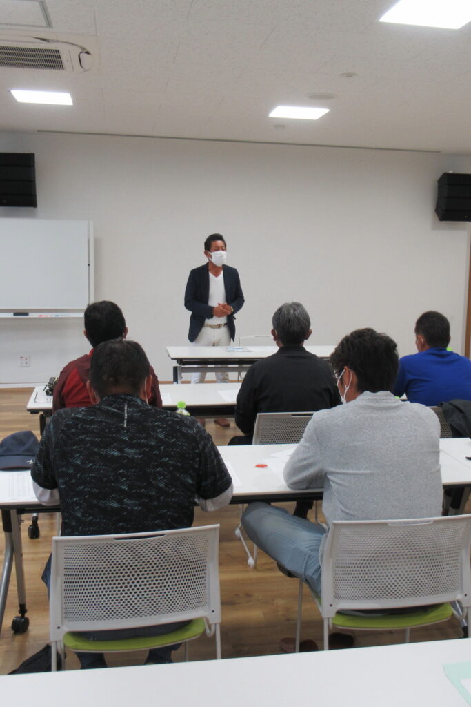 研修実施要領や2022年度事業計画、就農支援プログラムなどの説明。受け入れ農家講習会でJAしもつけ苺(いちご)部会の梁島源智部会長が講師を務めました。