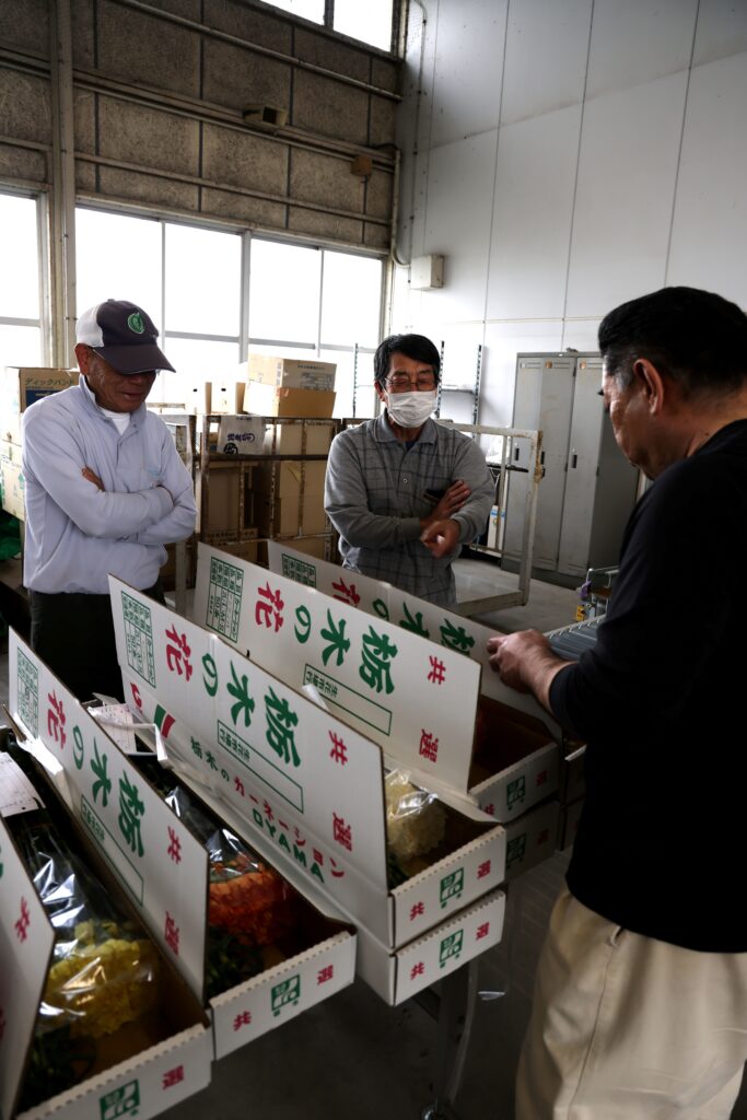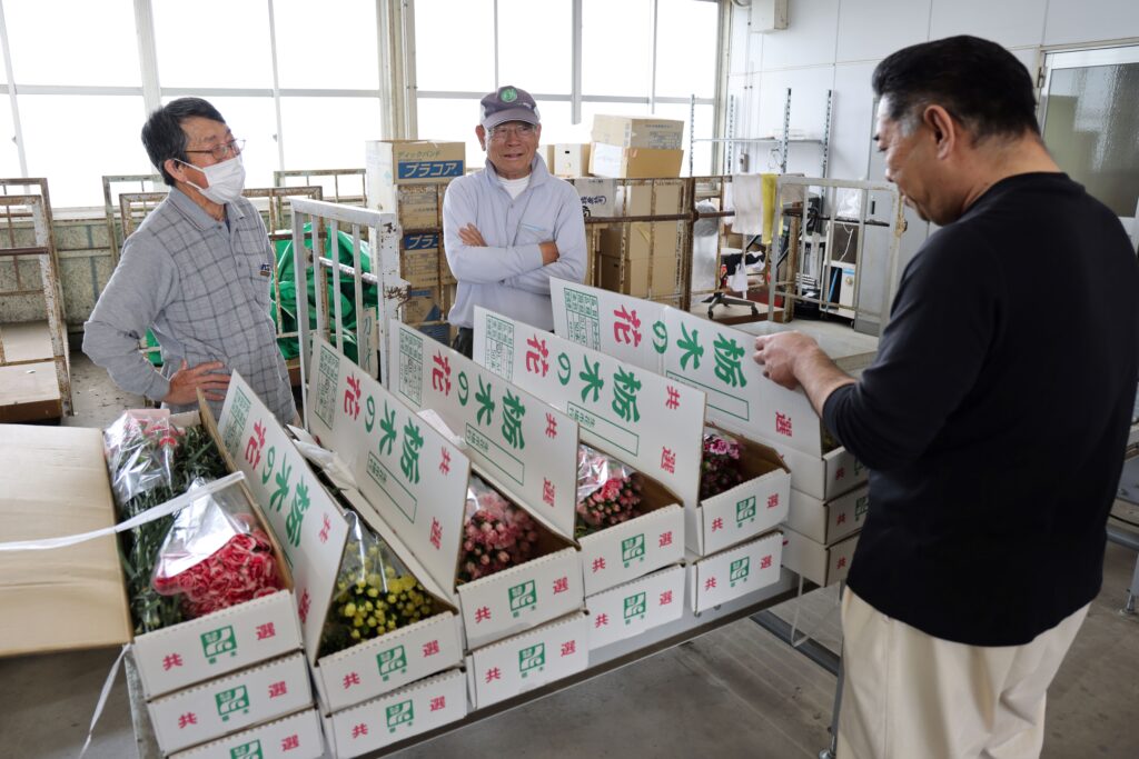 目ぞろえ会では、JAの担当職員が開花具合や色目、箱詰め方法などの出荷項目を説明。販売状況や、5月12日の「母の日」に向けて市場に好まれる花についても報告がありました。「母の日」には主に赤い「フォルテ」や、ピンクの「モモカ」「ピンクモンテズマ」の需要が高まるといいます。
