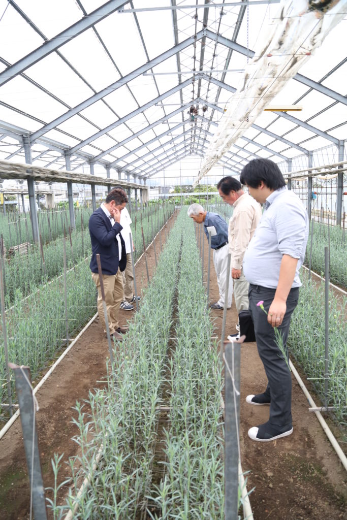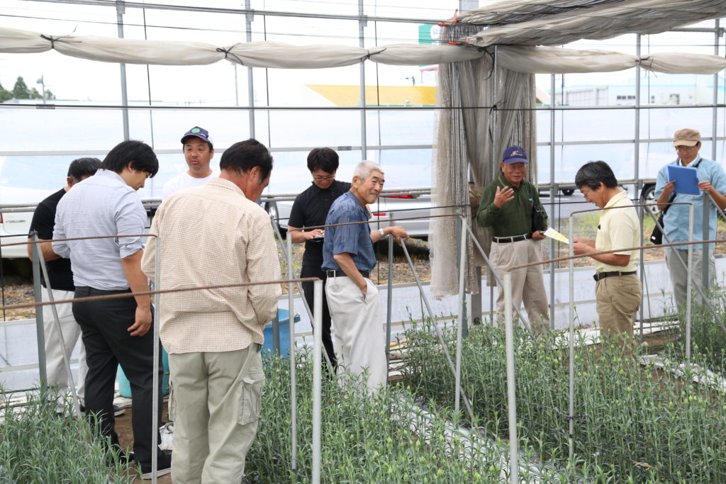 小山花卉(かき)園芸組合カーネーション部会は9月中旬、鹿沼市、栃木市、下野市、小山市の4ヶ所で現地検討会を開きました。生産者、市場担当者、関係機関ら11人が参加し、各ハウスを回り、生育状況や栽培管理、出荷時期などを確認しました。消費者が求めている品質や品種、生産の現状などについて意見交換しました。