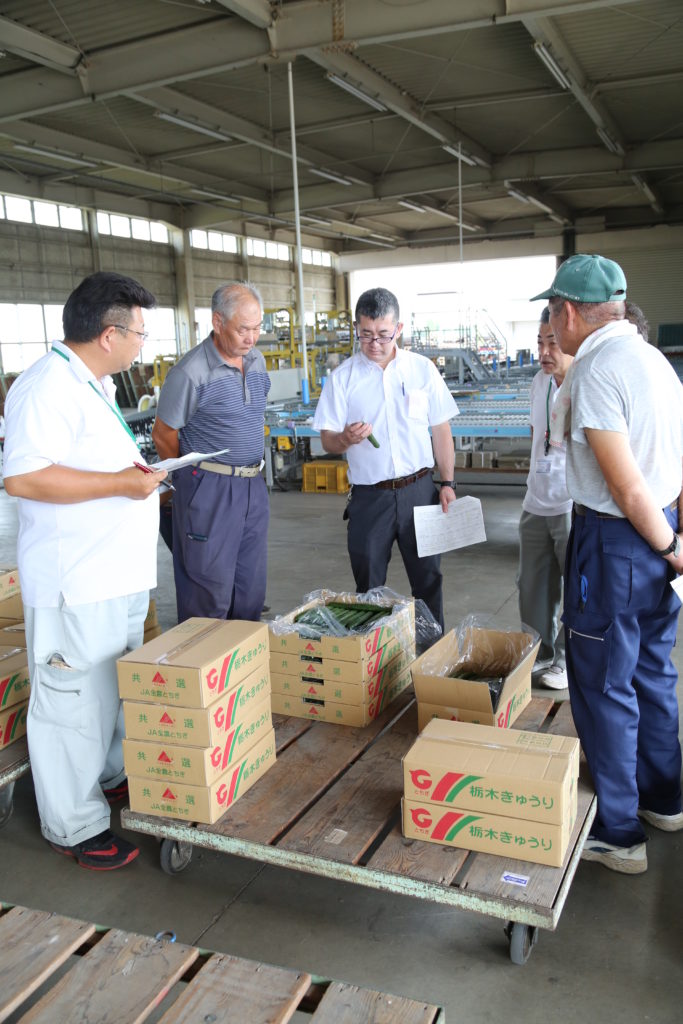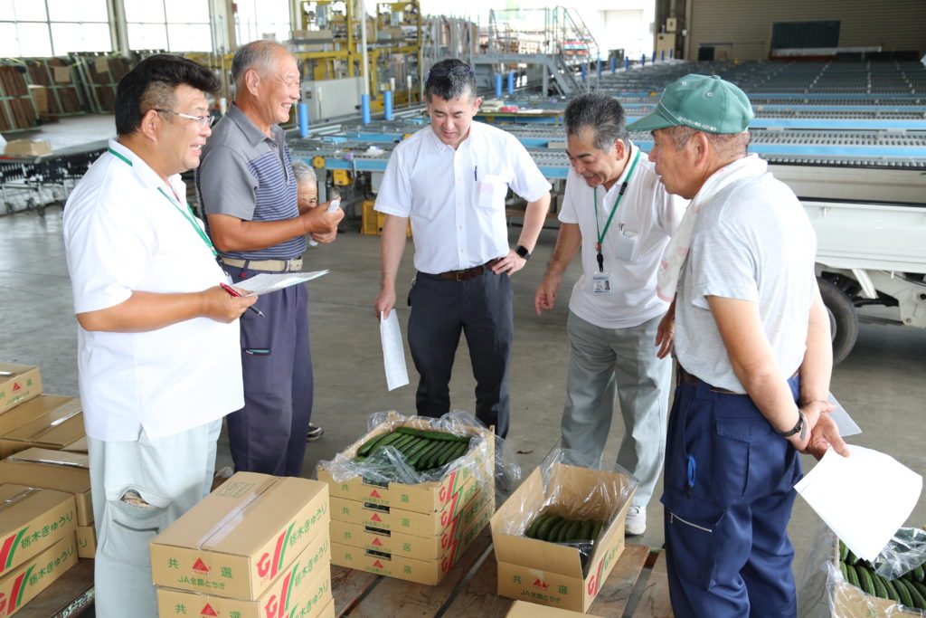 JAおやまで抑制キュウリの出荷が始まりました。JAおやま豊田きゅうり部会は9月中旬、西部集出荷所で目ぞろえ会を行い、生産者、市場関係者約15人が参加しました。