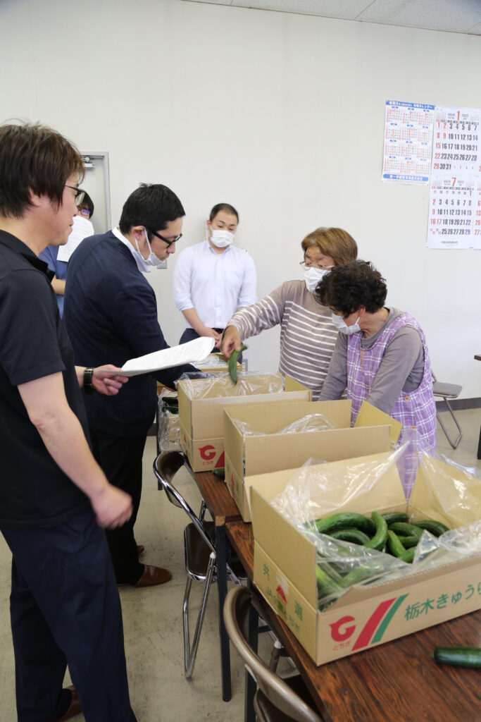 JAおやま南部・北部きゅうり部会は6月6日、小山市の東部集出荷所と下野市の北部集出荷所で、2023年産露地キュウリの目ぞろえ会を開きました。同部会、市場関係者ら約30人が参加。出荷最盛期に備え、出荷規格を確認しまし