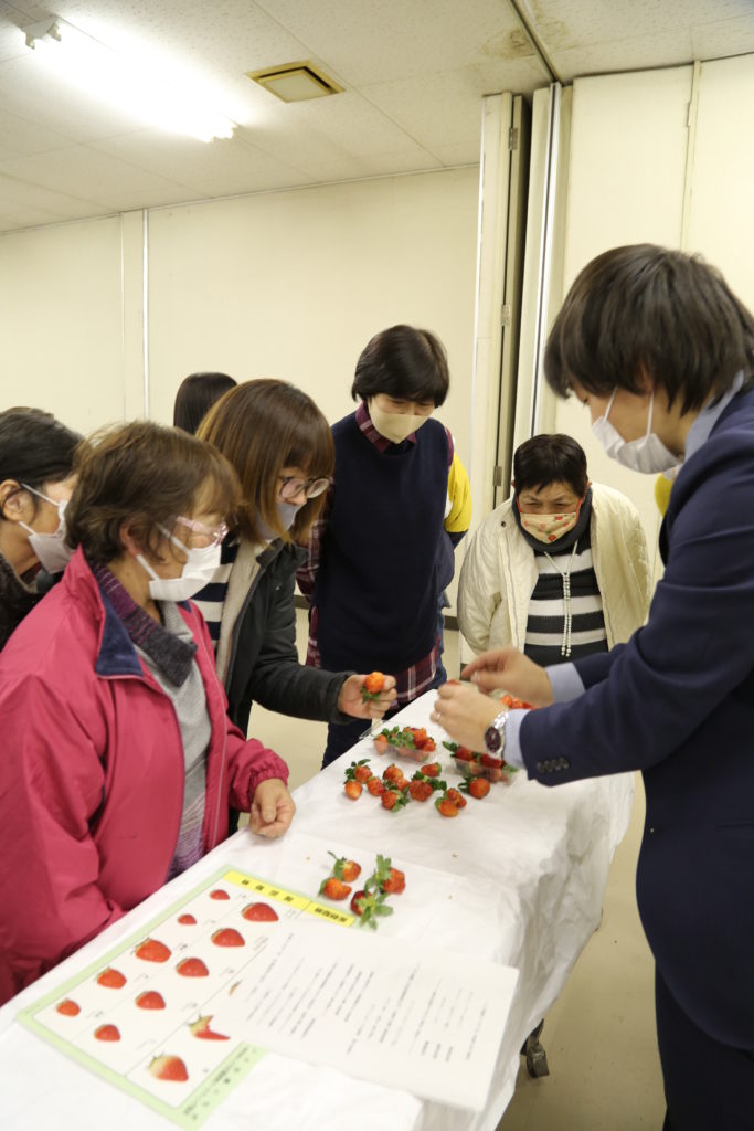 目ぞろえ会では、店頭に並んでいる状態をイメージしながら選果・選別することの重要性を確認しました。例年、定期的に実施していた目ぞろえ会を天候や品質状況に合わせ適期に開催することで、部会員の意識とイチゴの品質が向上し、販売先との信頼関係が強まっています。