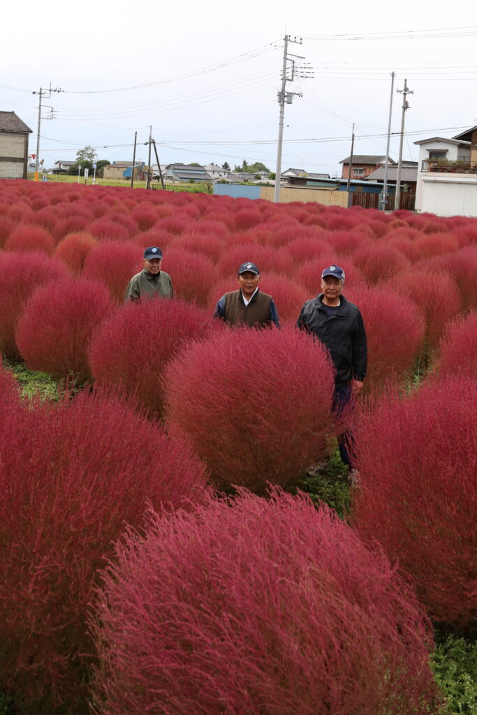 JAおやま管内の小山市豊田地区で、「ほうき草」と呼ばれるコキアが赤く染まり、見頃を迎えました。西アジア・中央アジア原産の1年草で、こんもりとした丸い形が特徴です。