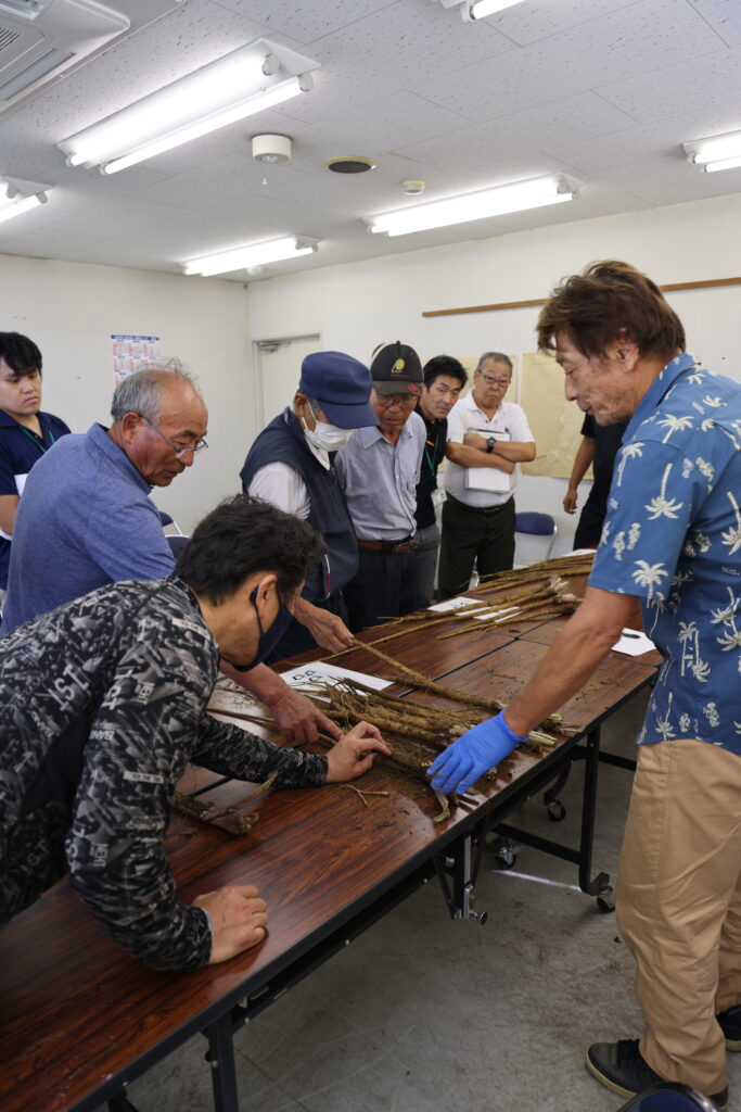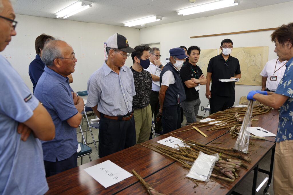 JAおやま牛蒡(ごぼう)部会は9月10日、桑集出荷所で秋冬ゴボウの目ぞろえ会を開きました。市場関係者が販売情勢を報告。JAの担当者が出荷要領や規格、注意点などを説明しました。現物1本ずつ等級を検討して太さや長さなどの選別基準の確認をしました。