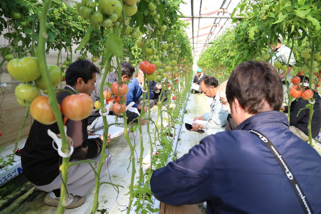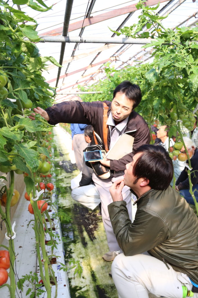 同事務所の三井俊宏副主幹が講師を務めた。各圃場(ほじょう)で水・草勢管理や実の付き具合を確認し、秀品率向上のポイントを説明、病害虫の防除徹底を呼び掛けました。部会は、69人が冬春トマトを約26ヘクタール栽培。10~7月に京浜・東北方面に出荷します。