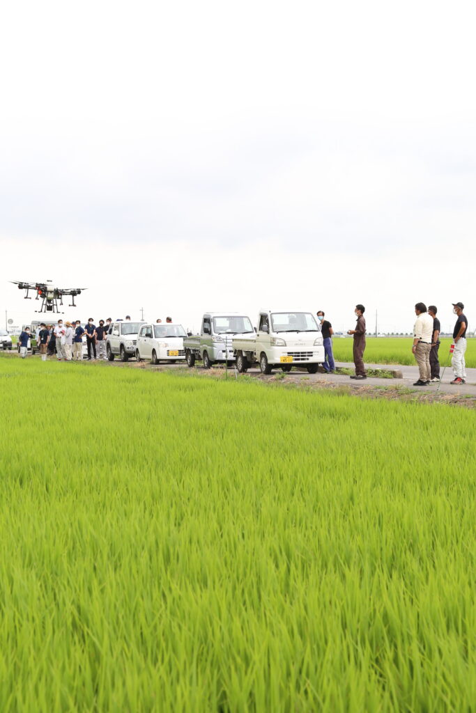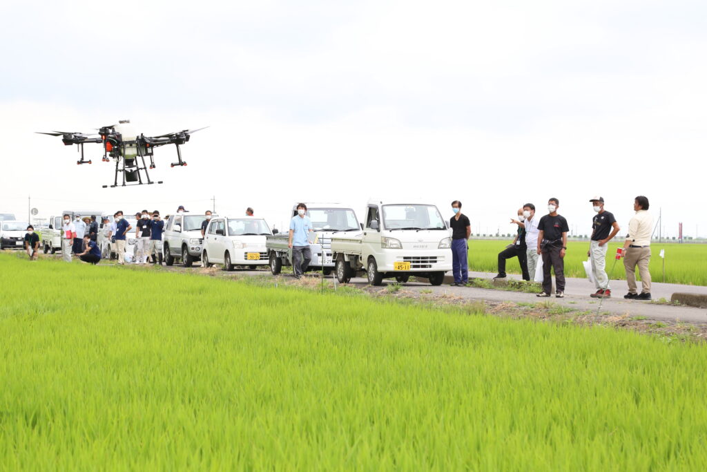 ドローンの実演会では、農薬散布資格持つ農薬メーカーが農業用ドローンを操作して航空防除を行いました。