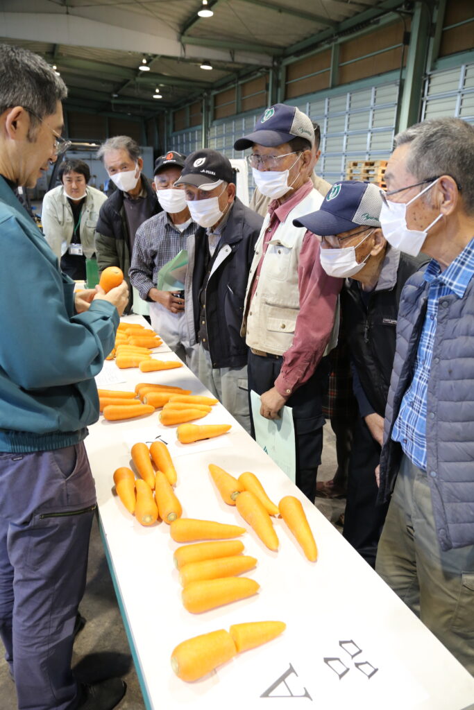 JAおやま人参(にんじん)部会は11月14日、桑青果物集出荷所で秋冬ニンジン目ぞろえ会を開きました。生産者、市場関係者ら19人が参加し、販売情勢や出荷要領、規格を確認しました。