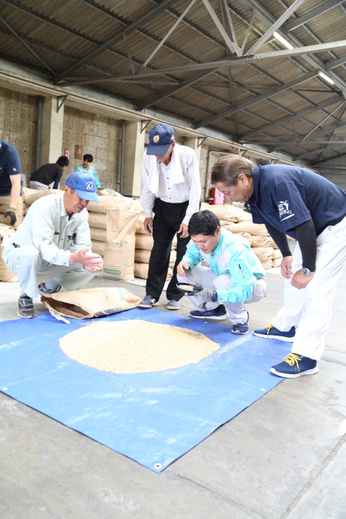 生産者は、刈り取り前に県下都賀振興事務所による2回の圃場(ほじょう)確認会を経て、万全の状態で検査を受けます。生産者がビール大麦を刈り取り、乾燥、調整したビール大麦種子を3人の検査員が検査しました。
