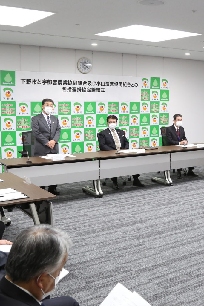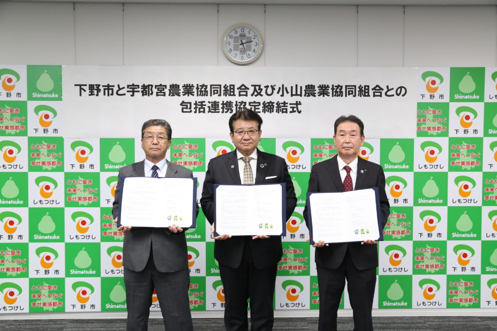 JAおやまは11月20日、JAうつのみやと下野市役所で下野市と包括連携協定を締結しました。下野市の広瀬寿雄市長、JAうつのみやの横松久夫組合長、JAおやま福田浩一郎組合長が調印しました。