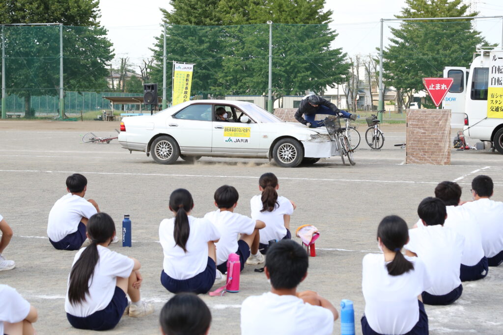 JAおやまの町田勝弥信用・共済担当常務は「自転車は身近で手軽な乗り物だが、交通ルール・乗り方を間違えると危険だ。スタントマンによる再現を見て、事故の恐ろしさを感じて、交通マナーの大切さを学んでほしい」と呼びかけました。