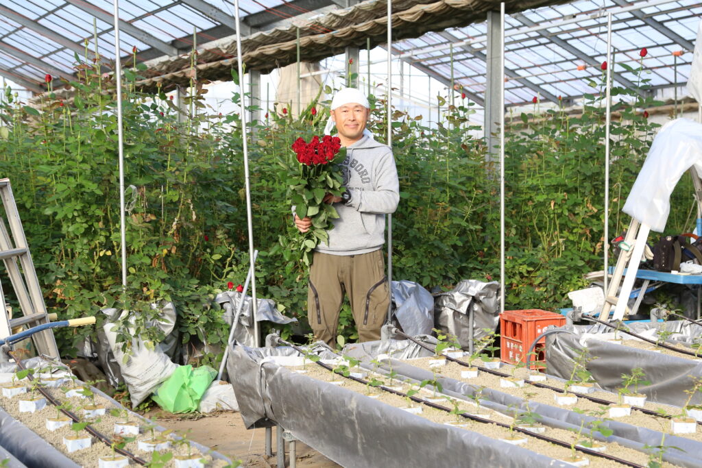 田辺さんはコロナ禍になり経営を見直し、2021年から栃木県内では珍しい「砂耕(礫耕・れきこう)栽培」を始めました。バラ栽培は、土壌に苗を植え育てる土耕や、ロックウールという鉱物から人工的に作られた繊維に苗を植える方法が主流ですが、低コストで水・肥料の管理がしやすい砂耕栽培に切り替えました。砂を使って栽培し、品質高度化や、使用後の処理簡略化など多くのメリットがあります。