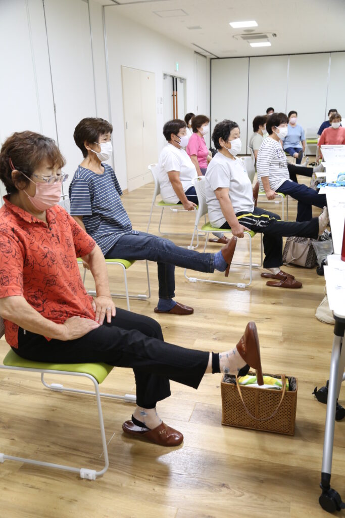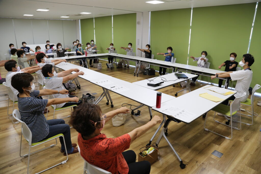 会員らは体操を実践する前に、介護予防のため百歳体操を実践した高知県の実例や筋力作り運動の必要性、効果的な体操など説明を受けました。その後、椅子に座りながら腕を前に上げる体操や膝を伸ばす運動、椅子を使って脚の後ろ上げ運動などを行いました。