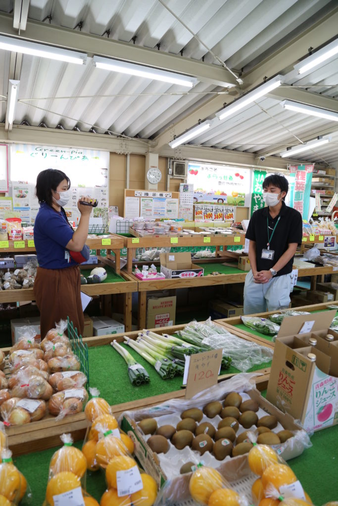 同校2年生が生活科の一環で自分の町を知るため、近くの商業施設である直売所「よらっせ桑」を見学し、リポートをまとめる活動を毎年行っています。今年は、新型コロナウイルスの感染防止のため、児童の直売所見学を中止。代わりに、担当教員が事前に直売所の写真を撮り、児童に見せて夏休み前に授業を行い、たくさんの質問が寄せられました。そのため、JAの担当者が、実際に児童が見学したように直売所の説明し、質問に答える形でのビデオレターの撮影を行いました。児童からは「一日に何人くらいのお客さんがくるのか」「野菜はどのように直売所に届くのか」「なぜ野菜以外のものも売っているのか」など約30項目の質問が寄せられました。