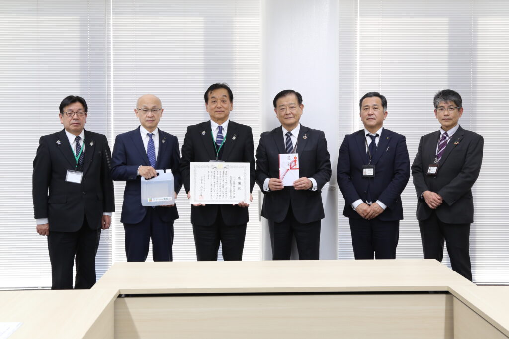 JAの渡邉文雄組合長と共済連栃木の田村登志郎本部長らが小山市役所を訪れ、濱口隆晴教育長に目録を手渡しました。