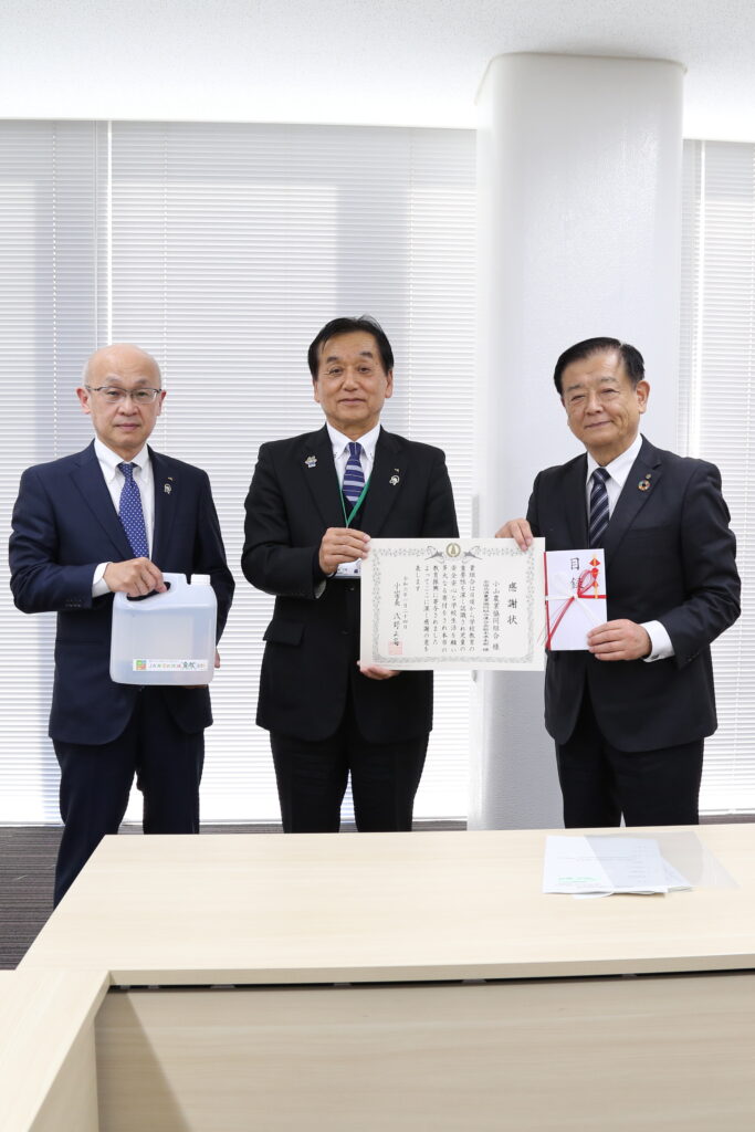 JAおやまとJA共済連栃木は1月24日、消毒液5リットルを小山市内の小中学校および特別支援学校36校にそれぞれ寄贈しました。