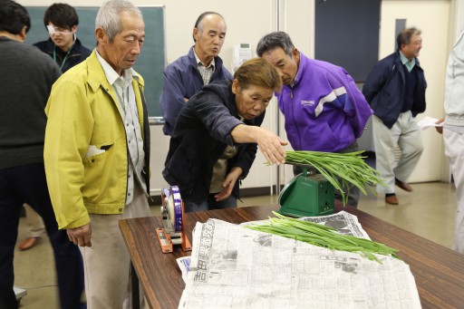 市場関係者が販売情勢を報告後、担当職員が出荷要領を説明。「枯葉、ゴミ、埃等を良く取り除いてから結束するよう、特に注意してほしい」と強調しました。目ぞろえ査定では、部会員が持ち寄ったニラを使用し、葉の長さや幅等の規格を確認。また、実際に袋詰めを行い、脱気の仕方や袋の留め方等について意見を交わしました。