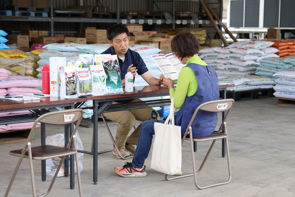 担当者は、落水散布やたん水散布といったさまざまな散布方法を説明しました。来場者は「使い方や効能を聞けてよかった」などと話しました。