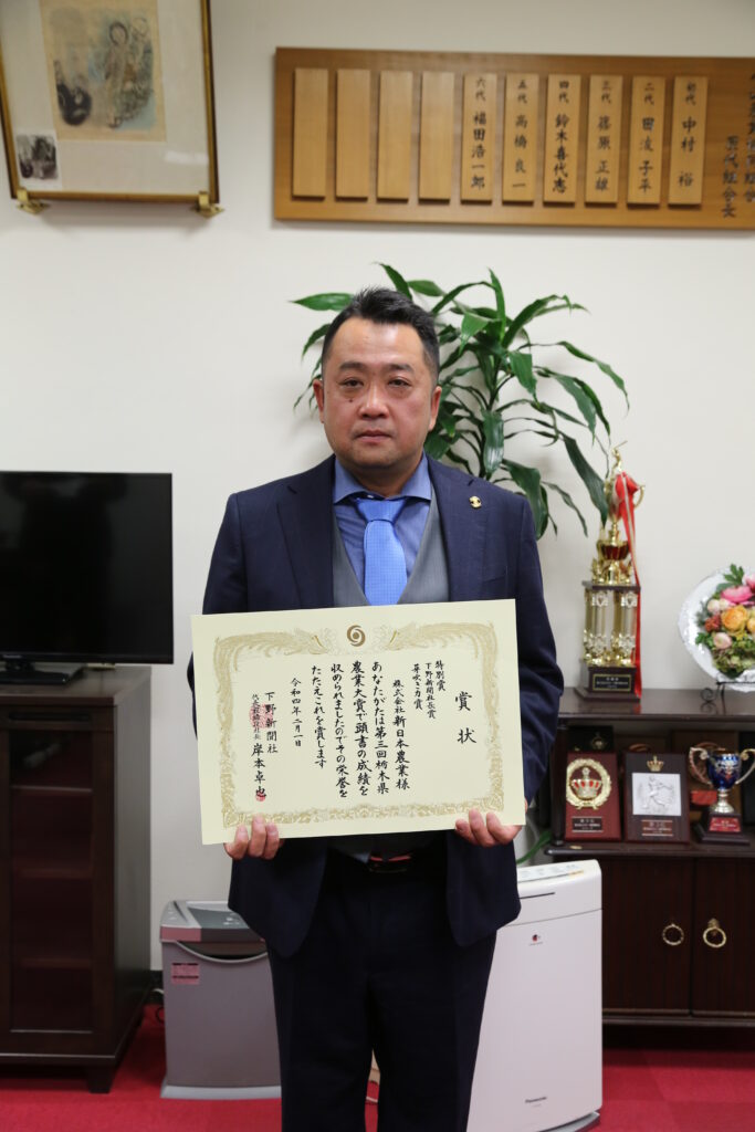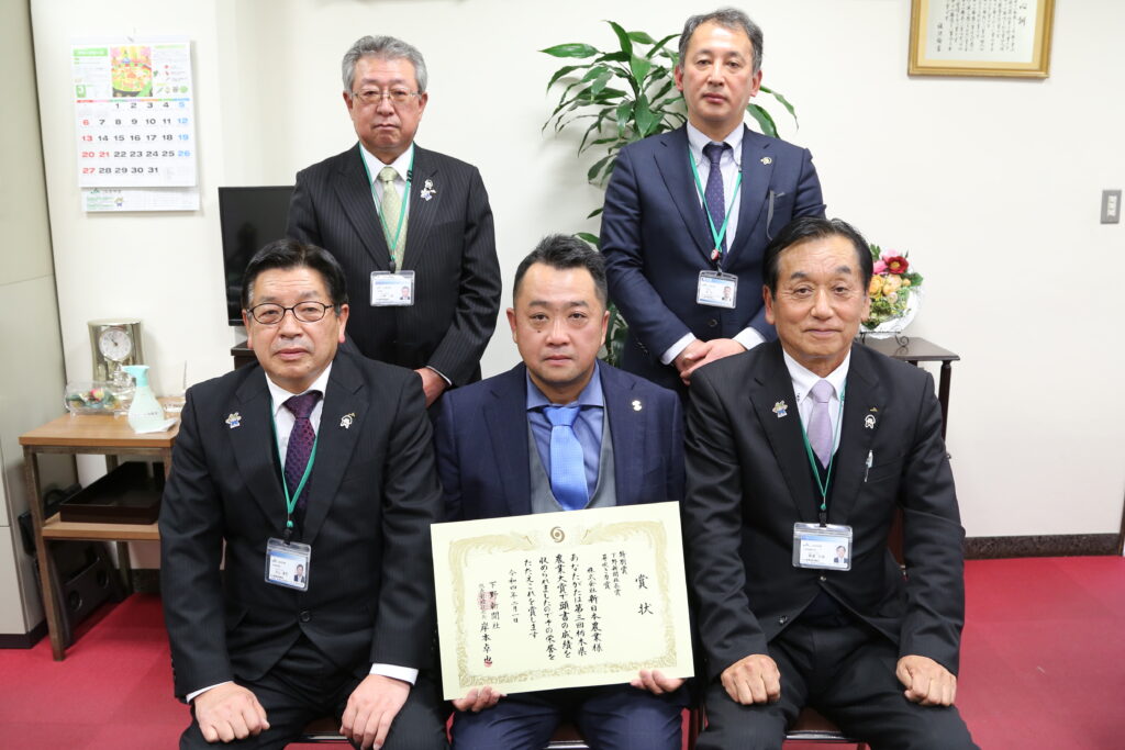 JAおやまは3月24日、本店で栃木県、JA栃木中央会、下野新聞社が行った第3回栃木県農業大賞の「芽吹き力賞・特別賞・下野新聞社賞」を受賞したJAおやまいちご部会の荒井聡さんの受賞報告会を行いました。