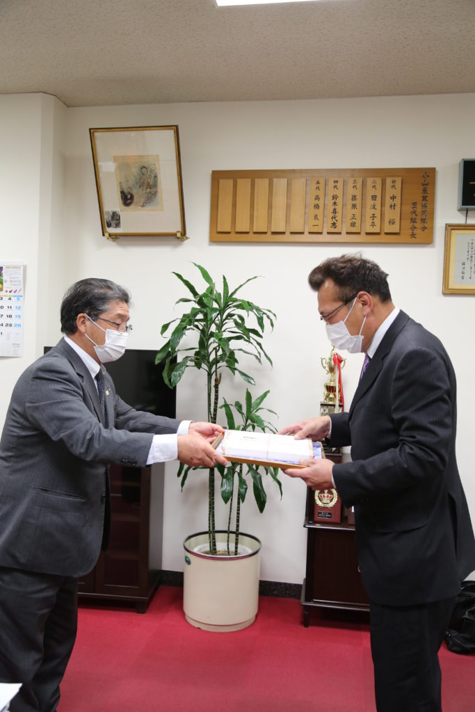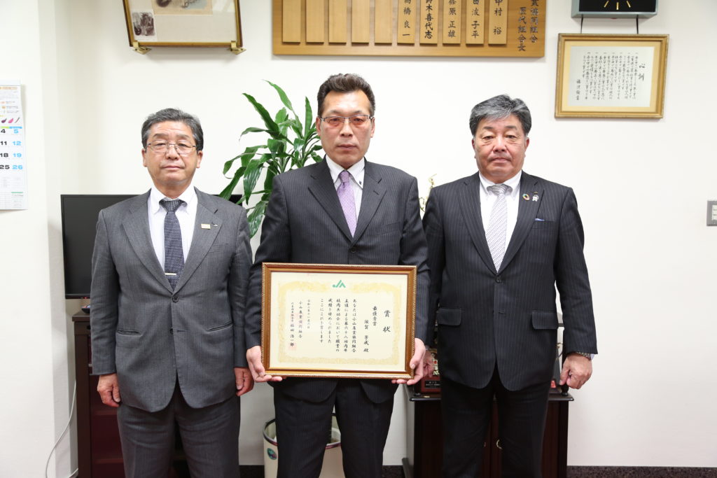 JAおやまは12月16日、本店で第68回小山農協肉牛枝肉共励会の最優秀賞に輝いた須賀芳成さんを表彰しました。毎年肥育牛部会の講演会とともに表彰式を開いていましたが、今年は新型コロナウイルス感染拡大で講演会を中止し、福田組合長らが表彰しました。