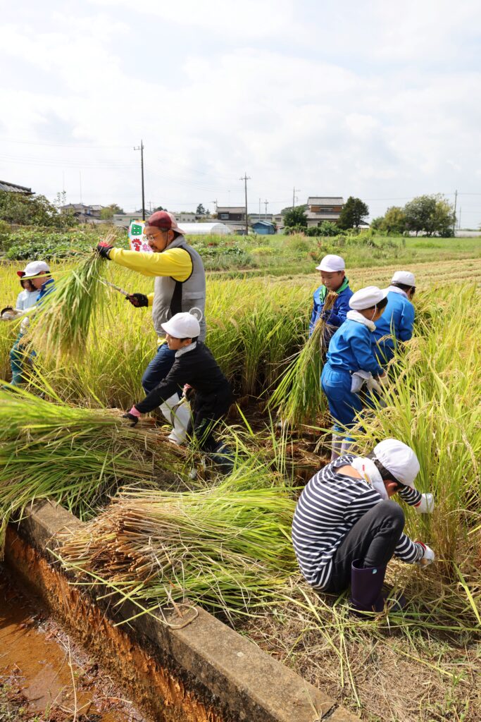 実行委員から丁寧に稲の刈り方の指導を受け、児童らは鎌を使って一生懸命刈り取りました。