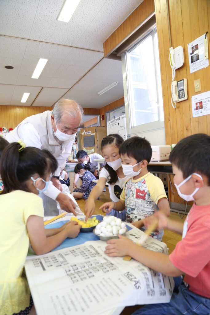 6月18日には、1、2年生が飼育した繭の収繭を実施しました。児童62人は、養蚕指導員の阿久津玄司さんと元養蚕農家の野沢正義さんに教わりながら、上蔟(じょうぞく)した繭をまぶしから外して「毛羽」を取り除きました。