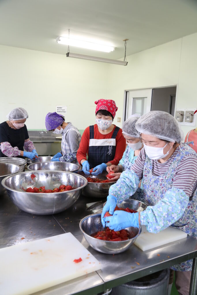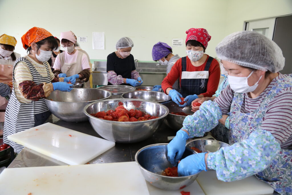 JAおやま西部女性会は6月8日、西部加工所でトマトソースを作りました。会員ら15人が参加し、地元産の規格外の生食用トマト約100キロを有効活用しました。