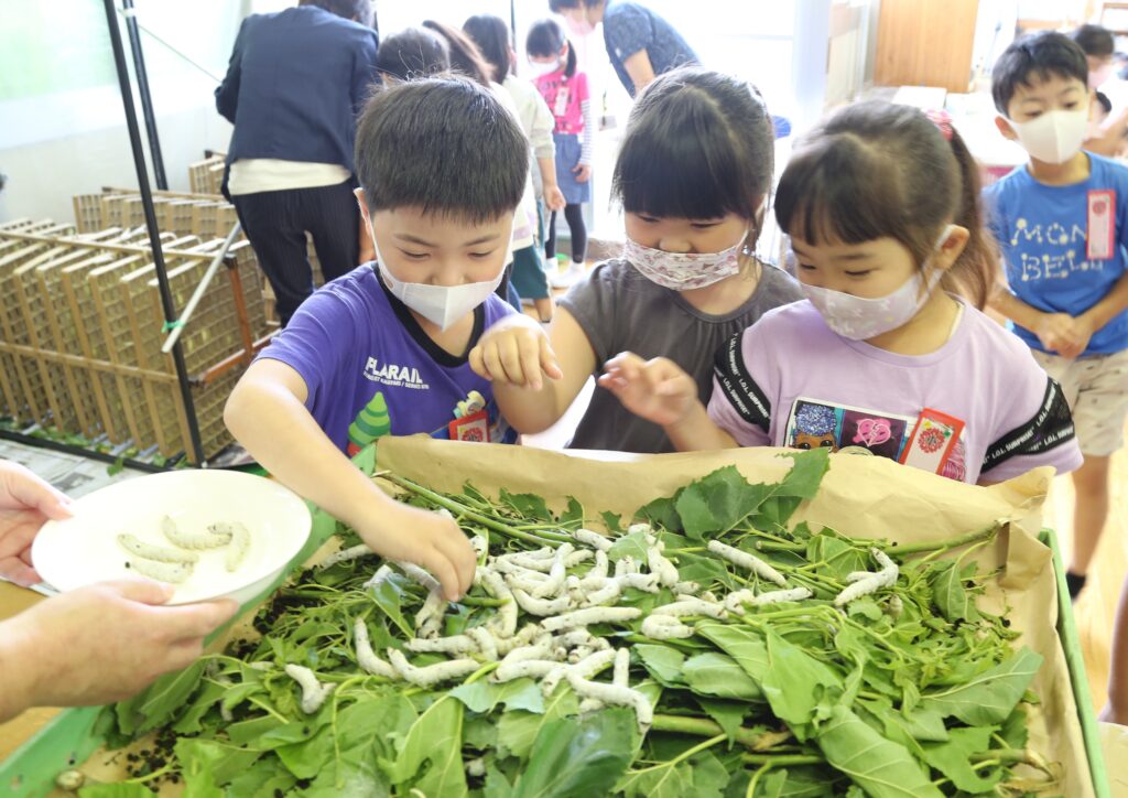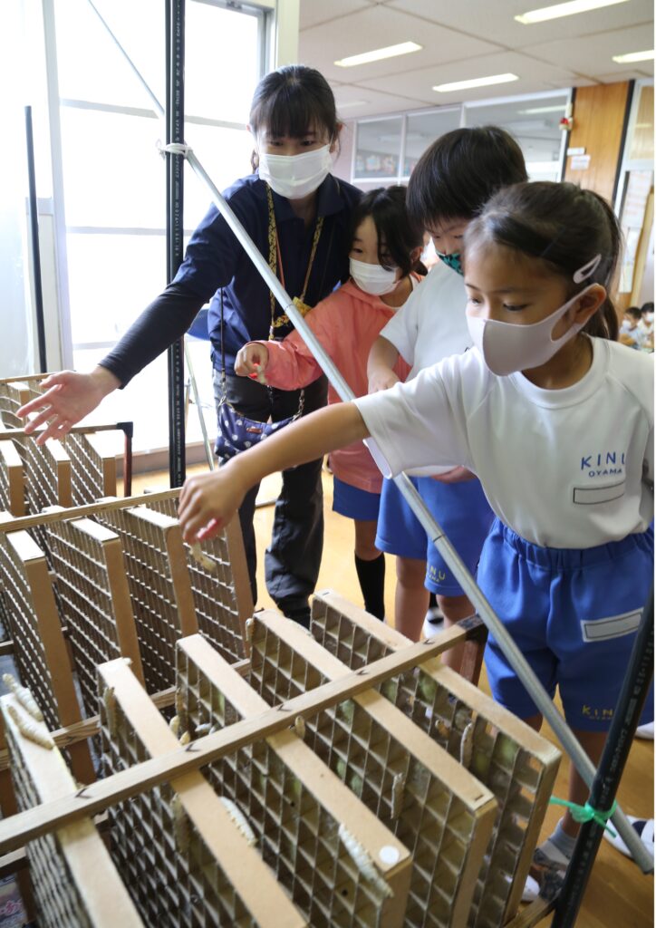 JAおやまでは、県内一の生産量を誇る養蚕を地域の人たちに知ってもらうため、管内五つの学校に、JA稚蚕飼育所で育てた普通蚕品種「春嶺鐘月(しゅんれいしょうげつ)」と黄金色の繭を作る「小山黄繭(おうけん)」を配布しています。体験学習を通して地域産業を学んでもらいます。