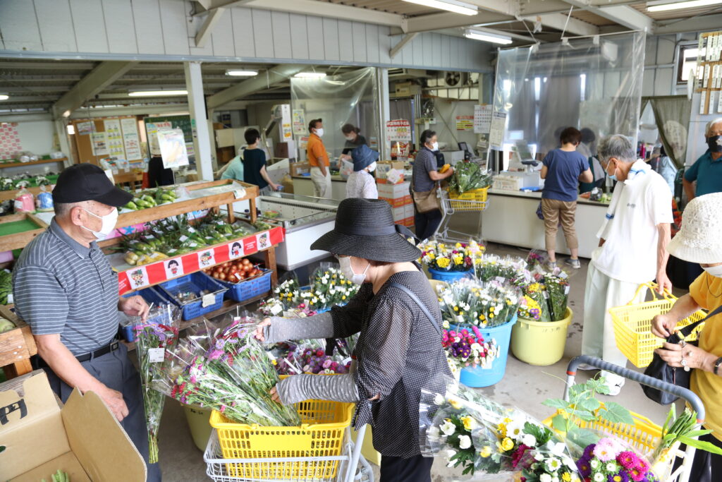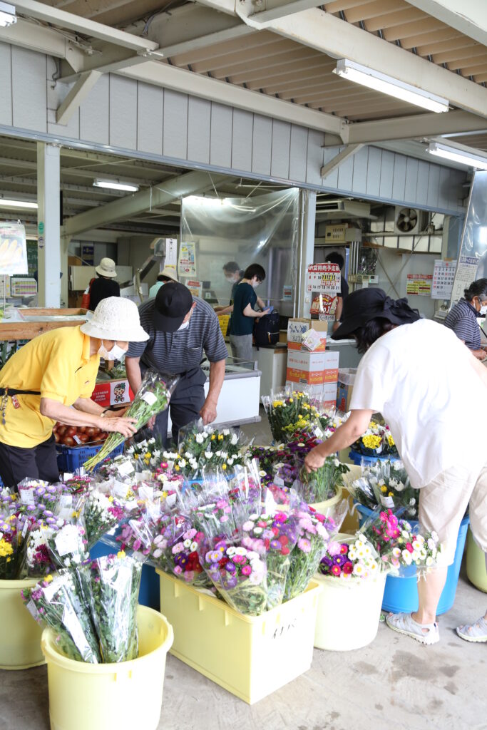 盆用の花は、長く持つと好評で各直売所で人気です。新型コロナウイルスの影響もあり、盆を自宅で過ごす人も多く、準備のため午前中から列ができました。